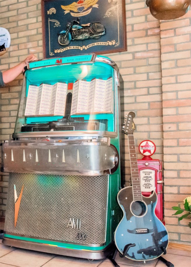 jukebox "One More Time", een neon verlichting, benzinepomp met